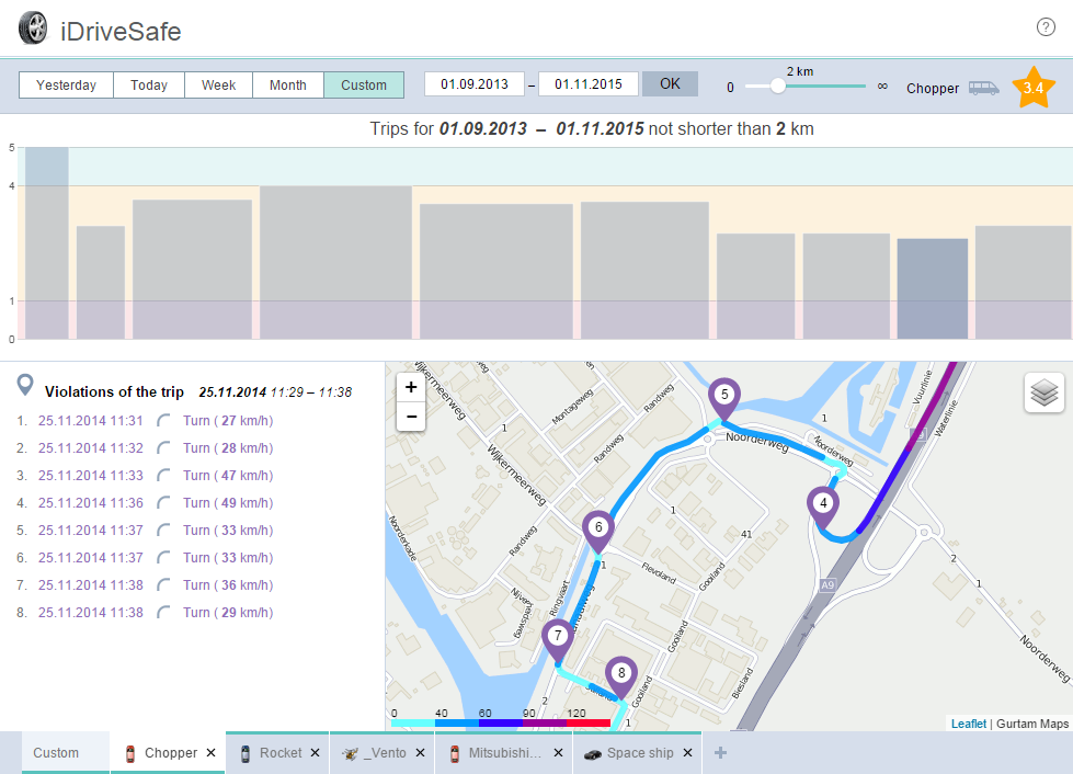 The list of violations made in a trip is shown on the left. Click a violation marker on the map in order a corresponding line from the list to be highlighted.