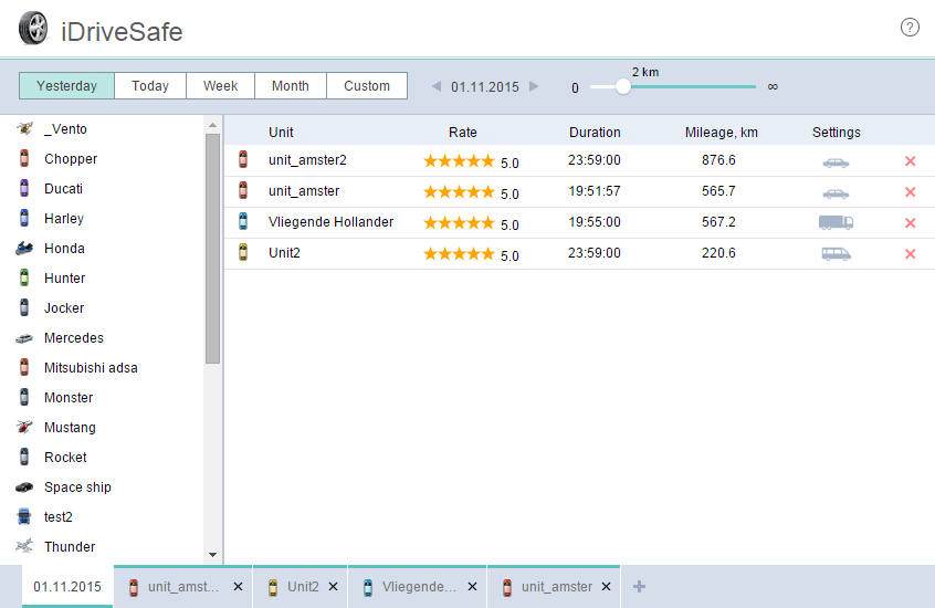 Double-click units in the work list in order to choose them. They are added to statistics table where the assessment is automatically made. The following data is shown in the table: driving quality assessment, trip duration, mileage, and the settings (vehicle type, assessment strictness).